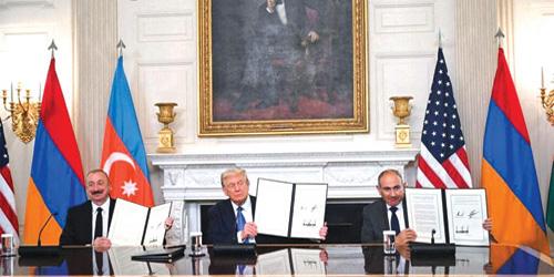 وقعت أرمينيا وأذربيجان في «واشنطن» بوساطة أمريكية، إعلانا مشتركا يضع حدا «نهائيا» للقتال بينهما، ويتضمن إقامة علاقات دبلوماسية وتجارية كاملة والاحترام المتبادل لسيادة وسلامة أراضي كل منهما. ونص الاتفاق الذي رعاه الرئيس الأمريكي دونالد ترامب في قمة بالبيت الأبيض جمعت الرئيس