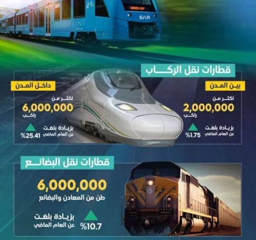 سجلت خدمات النقل عبر الخطوط الحديدية في المملكة أرقامًا قياسية تجاوزت أكثر من 8.7 ملايين راكب خلال الربع الأول من العام الحالي 2024م، وبنسبة نمو بلغت 28%، بزيادة بلغت عن الربع الأول من العام الماضي، حيث أسهمت خدمات نقل الركاب عبر القطارات في نقل أكثر من 2.7 مليون راكب عبر