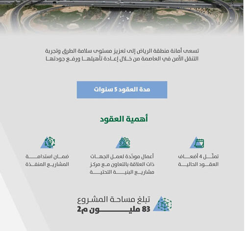 أعلنت أمانة منطقة الرياض توقيع 5 عقود لرفع جودة الطرق في العاصمة، امتدادًا لخططها الإستراتيجية في تحسين تجربة التنقل، حيث بلغت مساحة العمل ضمن نطاق العقود 83 مليون متر مربع ولمدة 5 سنوات؛ لرياض نابضة بالحياة وفق أفضل معايير الكفاءة والاستدامة.
