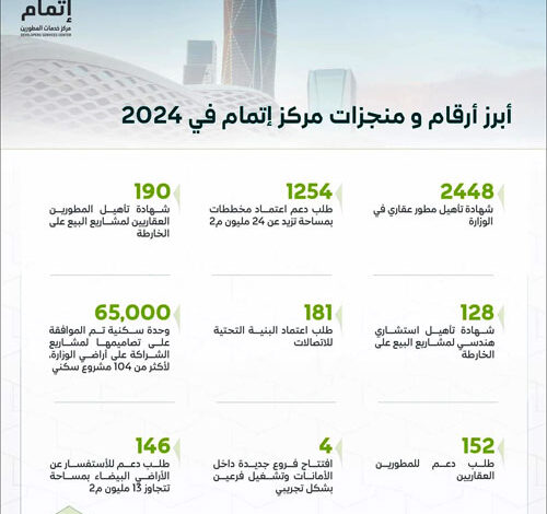 كشف مركز خدمات المطورين «إتمام» عن اعتماد أكثر من 1250 مخططًا بمساحات تتجاوز 24 مليون م2، واعتماد تصاميم لأكثر من 65 ألف وحدة سكنية للمشاريع السكنية على أراضي وزارة البلديات والإسكان خلال العام 2024.
