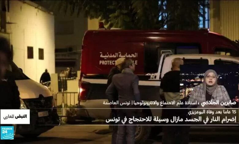 في النبض المغاربي، تونس، وظاهرة اضرام النار في الجسد متكررة بعد خمسة عشر عاما من مصرع الشاب محمد البوعزيزي بعد اضرام النار في جسده احتجاجا على وضعه في الاسبوع الماضي. خمس عمليات سُجلت في ظرف ثلاثة ايام. السلطات حتى الان تتحدث غالبا عن افراد يعانون من اضطرابات نفسية او عقلية. طريقة للتعبير على مآسي اجتماعية لا يُسلط عليها الضوء. كانت معنا حول الموضوع استاذة علم الاجتماع والانثروبولوجيا صابرين الجلاصي