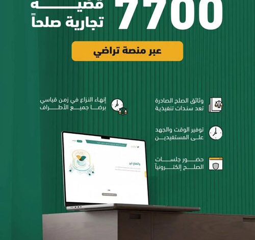أنهت وزارة العدل من خلال مركز المصالحة 7700 قضية تجارية صلحًا، عبر منصة تراضي الإلكترونية، وذلك حتى نهاية 2023، بعيدًا عن الدعاوى القضائية، وأروقة المحاكم، من خلال إجراءات ميسرة وسريعة، وذلك تحقيقًا لمستهدفات مبادرة «تفعيل منظومة المصالحة»، إحدى مبادرات برنامج التحول الوطني،