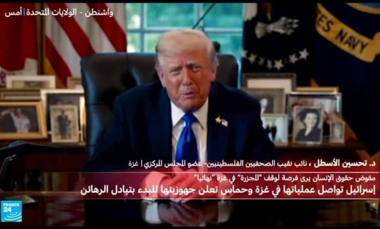 منذ إعلان حركة حماس موافقتها الجمعة على خطة الرئيس الأمريكي دونالد ترامب بشأن غزة، خفت إلى حد كبير عمليات القصف الإسرائيلي على القطاع الفلسطيني وفقا لما أكد تحسين الأسطل، نائب نقيب الصحفيين الفلسطينيين. المتحدث بسط أيضا في حديثه لفرانس24 احتمالات تنفيذ خطة ترامب ونقل تفاؤل الفلسطينيين بإيجاد مخرج للأزمة.