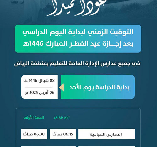 يعاود نحو 1,7 مليون طالب وطالبة في مدارس الإدارة العامة للتعليم بمنطقة الرياض بجميع مراحلها التعليمية، لاستكمال الفصل الدراسي الثالث من العام الدراسي الحالي اليوم الأحد، وذلك بعد تمتعهم بإجازة عيد الفطر المبارك.