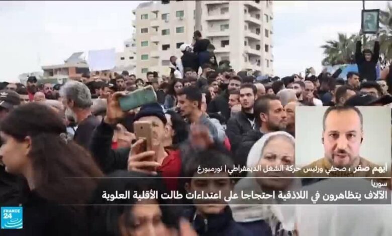 تظاهر الآلاف الثلاثاء في مدينة اللاذقية الساحلية ومناطق أخرى ذات غالبية علوية في سوريا، تنديدا باعتداءات استهدفت هذه الأقلية في الآونة الأخيرة، وفق ما أفاد مراسلو وكالة فرانس برس. منذ الإطاحة بحكم الرئيس المخلوع بشار الأسد قبل نحو عام، يتعرض أبناء الطائفة التي ينحدر منها لهجمات متكررة، وقد قتل المئات منهم في حوادث وقعت في مارس/آذار الماضي بعدد من قرى الساحل السوري. وردّد المتظاهرون الذين احتشدوا في دوار الأزهري وسط اللاذقية هتافات من بينها “الشعب السوري واحد”.. “يا عالم اسمع اسمع.. الشعب العلوي ما بيركع”. ورفع آخرون لافتات تطالب بـ “الافراج عن المعتقلين”.