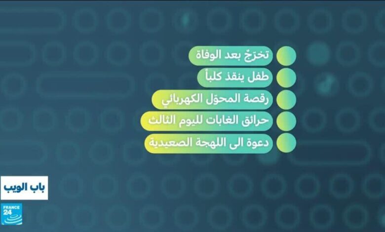 تستعرض هذه الحلقة من باب الويب العناوين التالية: الأردن .. تخرّج بعد الوفاة، السودان.. طفل ينقذ كلباً، العراق .. رقصة المحوّل الكهربائي، الجزائر ..حرائق الغابات لليوم الثالث وفي مصر، دعوة الى اللهجة الصعيدية.