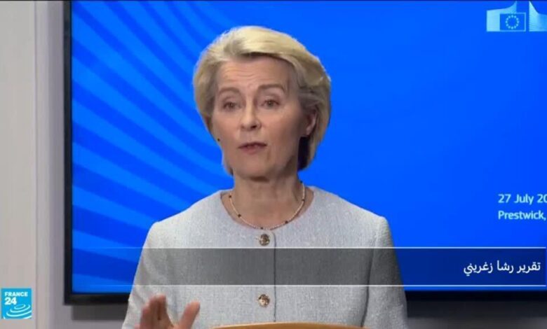 قبل أيام من دخول الرسوم الجمركية الأمريكية حيز التنفيذ نجحت رئيسة المفوضية الأوروبية أورسولا فون دير لاين بخفض هذه الرسوم من 30 الى 15 في المئة، مقابل تخصيص الاتحاد 750 مليار دولار لشراء الطاقة من الولايات المتحدة وشراء عتاد عسكري بمئات المليارات بالإضافة إلى استثمارات أوروبية داخل الولايات المتحدة.