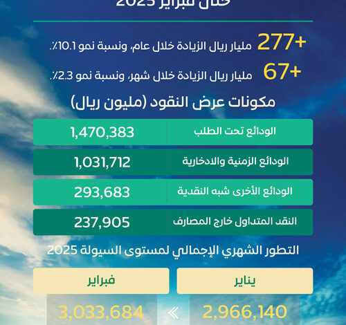 سجلت مستويات السيولة «النقود المتاحة» في الاقتصاد السعودي نموًا إيجابيًا، حيث بلغت أعلى مستوياتها التاريخية بنهاية شهر فبراير من عام 2025م، بارتفاع سنوي قدره 277,490 مليون ريال، بنسبة نمو بلغت 10.1 في المائة، ليصل إجمالي السيولة إلى 3,033,684 مليون ريال، مقارنة بـ 2,756,193
