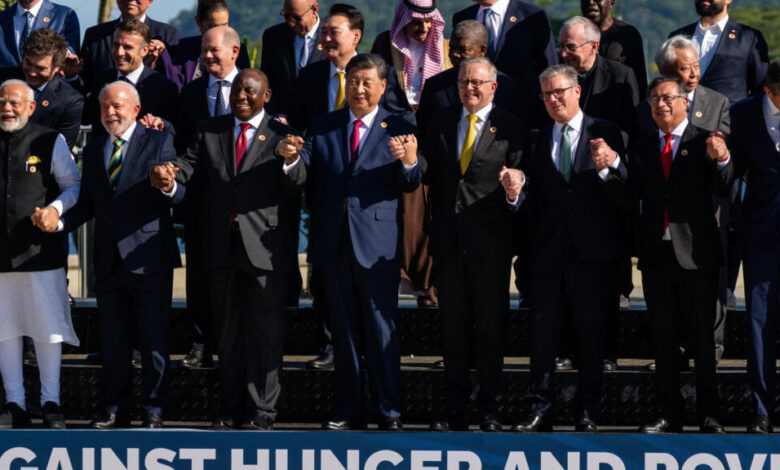 دعا زعماء مجموعة العشرين الإثنين، إلى وقف إطلاق النار في غزة ولبنان، وتكثيف المساعدات الإنسانية، مع التركيز على مكافحة الفقر وتغير المناخ. وشهدت القمة المنعقدة في البرازيل نقاشات حول التحولات في النظام العالمي ودور الاقتصادات النامية في مواجهة الأزمات العالمية.