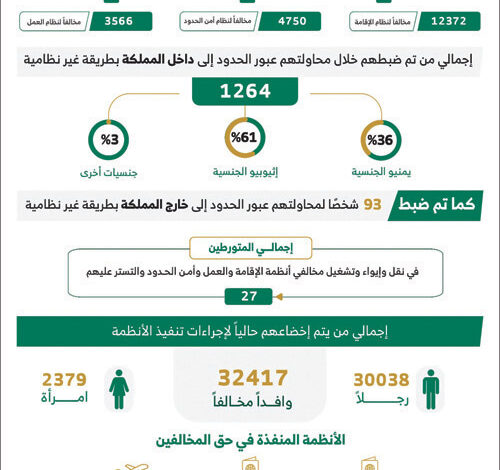 أسفرت الحملات الميدانية المشتركة لمتابعة وضبط مخالفي أنظمة الإقامة والعمل وأمن الحدود، التي تمت في مناطق المملكة كافة، وذلك للفترة من 12/ 10/ 1446هـ الموافق 10/ 04/ 2025م إلى 18/ 10/ 1446هـ الموافق 16/ 04 / 2025م، عن النتائج التالية: