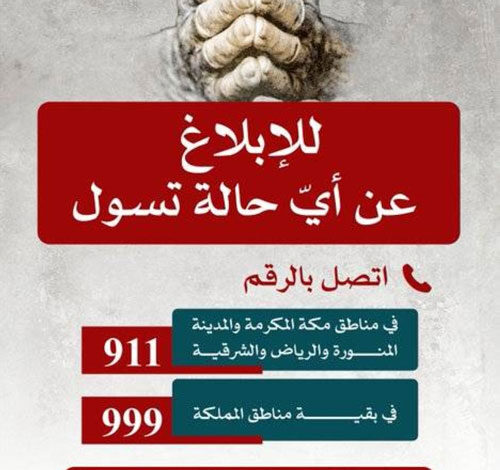 أكدت وزارة الداخلية أن التسول محظور بكافة صوره وأشكاله، مهما كانت مسوغاته، ويُعاقب كل من امتهن التسول أو حرض غيره أو اتفق معه أو ساعده -بأي صورة كانت- على امتهان التسول، بالسجن والغرامة والإبعاد لغير السعوديين -عدا زوجة السعودي أو زوج السعودية أو أولادها- بعد انتهاء عقوبته