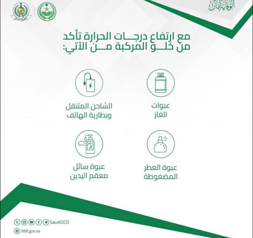 أكدت المديرية العامة للدفاع المدني، ضرورة خلو المركبات من المواد القابلة للاشتعال، نظرًا لارتفاع درجات الحرارة في مناطق المملكة، ما قد يؤدي إلى حدوث حرائق. وشددت على عدم ترك الشواحن المتنقلة وبطاريات الهواتف، وعبوات الغاز، والعطور، وعبوات معقم اليدين، وغيرها من المواد القابلة