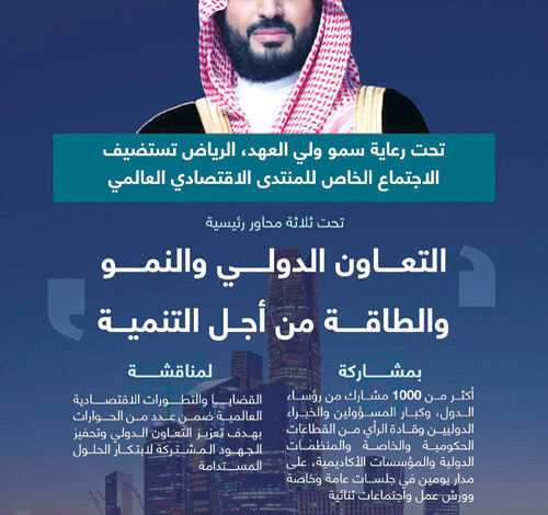 تحت رعاية صاحب السمو الملكي الأمير محمد بن سلمان بن عبدالعزيز آل سعود، ولي العهد رئيس مجلس الوزراء -حفظه الله-، تستضيف مدينة الرياض خلال الفترة من 28 – 29 أبريل الجاري، الاجتماع الخاص للمنتدى الاقتصادي العالمي، تحت شعار: «التعاون الدولي والنمو والطاقة من أجل التنمية» وهو