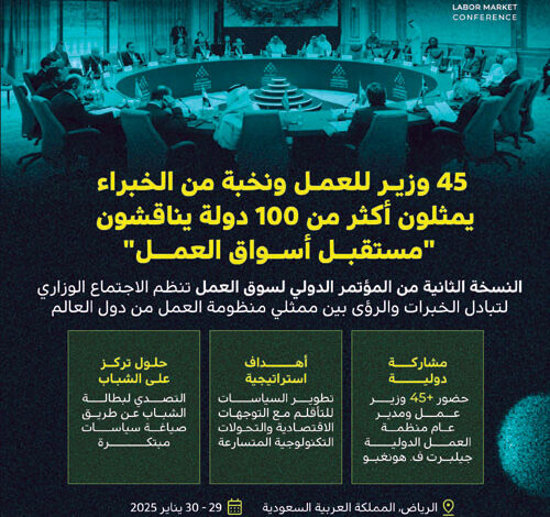 تستضيف الرياض، يوم الأربعاء 29 رجب 1446هـ الموافق 29 يناير 2025م، الاجتماع الوزاري الدولي الخاص بالنسخة الثانية من المؤتمر الدولي لسوق العمل الذي يأتي برعاية من خادم الحرمين الشريفين الملك سلمان بن عبدالعزيز آل سعود -حفظه الله-، ومشاركة أكثر من 45 وزيرًا للعمل من دول مختلفة