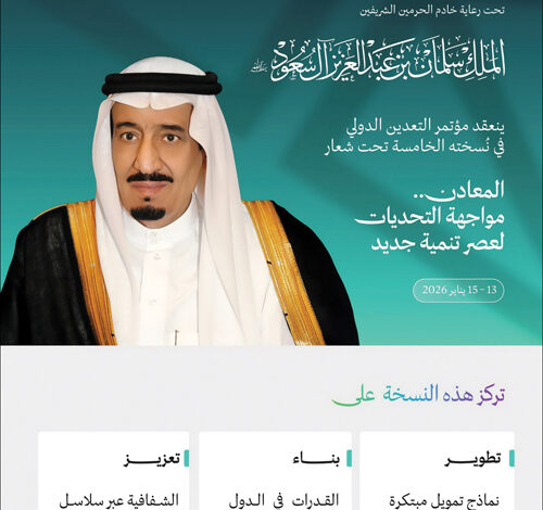 تحت رعاية خادم الحرمين الشريفين الملك سلمان بن عبدالعزيز آل سعود -حفظه الله-، تُعقد النسخة الخامسة من مؤتمر التعدين الدولي خلال الفترة من 13 إلى 15 يناير 2026 بمدينة الرياض، تحت شعار «المعادن.. مواجهة التحديات لعصر تنمية جديد»، وذلك بتنظيمٍ من وزارة الصناعة والثروة المعدنية.