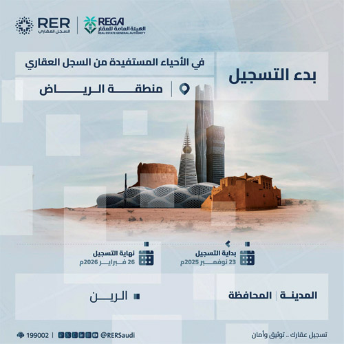 أعلن السجل العقاري اليوم، بدء استقبال طلبات التسجيل العيني الأول لـ 148,432 قطعة عقارية في منطقة حائل ومحافظة الرين بمنطقة الرياض.