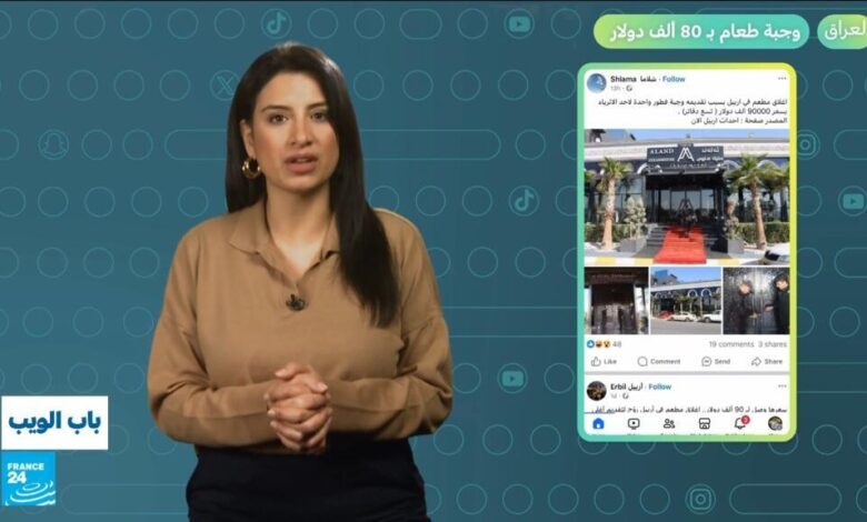 تستعرض هذه الحلقة من برنامج “باب الويب” الفقرات التالية: العراق.. وجبة طعام بـ 80 ألف دولار. الجزائر.. لاعب يحمل هاتفه خلال مباراة لكرة القدم. تركيا.. تغريم سوري غسل سيارته عند نافورة مياه. السودان.. طائرة مدنية تصب إلى مطار كسلا. السعودية.. معلمة تنقل طلابها إلى الملعب بطريقة طريفة.
