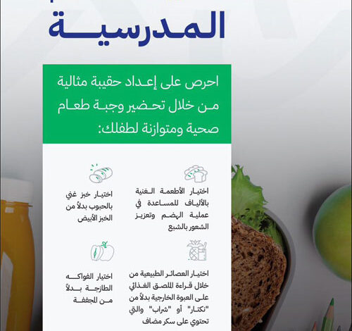 شددت الهيئة العامة للغذاء والدواء على أهمية توفر العناصر الغذائية الصحية في حقيبة الطعام المدرسية للطلاب؛ لدورها المهم في تحسين الأداء، وزيادة التركيز، وتزويد الجسم بالطاقة، والتخلص من الشعور بالإرهاق والجوع خلال اليوم الدراسي.