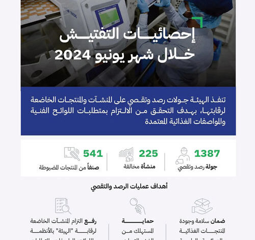 ضبطت الهيئة العامة للغذاء والدواء نحو (225) منشأةً مخالفة و(541) صنفًا من المنتجات خلال (1387) جولة رصد وتقص نفذتها على المنشآت والمنتجات الخاضعة لإشرافها في جميع مناطق المملكة خلال شهر يونيو لعام 2024.