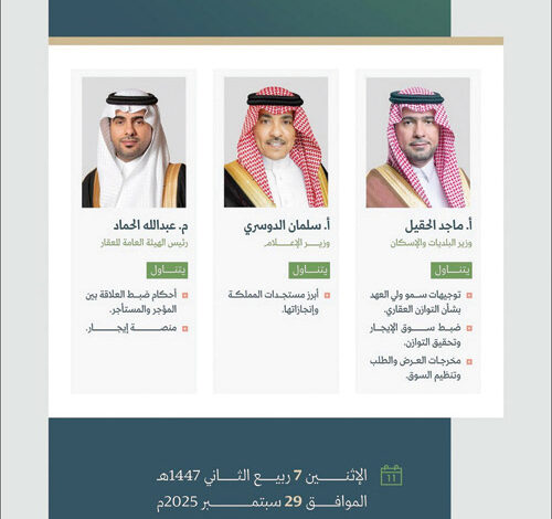 ينعقد المؤتمر الصحفي الحكومي يوم الاثنين 29 سبتمبر 2025، الذي يستضيف معالي وزير البلديات والإسكان الأستاذ ماجد بن عبدالله الحقيل؛ للحديث عن رؤية القيادة ومنطلق التوازن العقاري، وتوجيهات صاحب السمو الملكي الأمير محمد بن سلمان بن عبدالعزيز آل سعود ولي العهد رئيس مجلس الوزراء