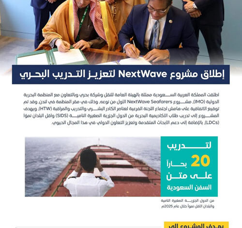 أطلقت المملكة ممثلة بالهيئة العامة للنقل وشركة بحري وبالتعاون مع المنظمة البحرية الدولية (IMO)، مشروع NextWave Seafarers الأول من نوعه في مقر المنظمة في لندن، وجرى توقيع الاتفاقية على هامش اجتماع اللجنة الفرعية لعناصر الكادر البشري والتدريب والمراقبة (HTW) بالمنظمة البحرية