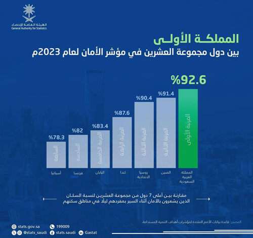 المملكة تتصدر دول مجموعة العشرين في مؤشر الأمان لعام 2023
