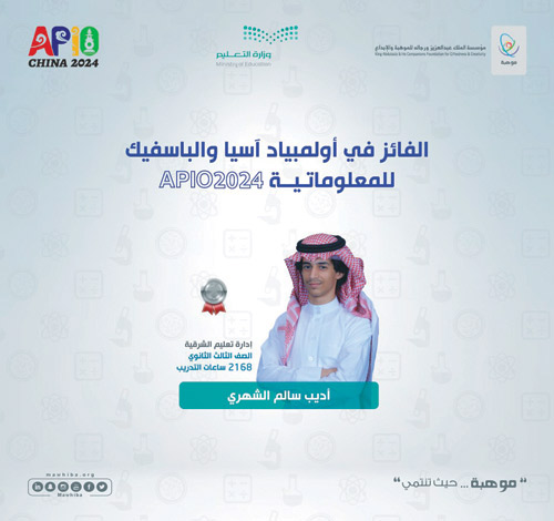 حصدت المملكة العربية السعودية، ممثلة في مؤسسة الملك عبدالعزيز ورجاله للموهبة والإبداع «موهبة»، ووزارة التعليم، ميدالية فضية في أولمبياد آسيا والباسيفيك للمعلوماتية 2024 APIO الذي نظمته جمهورية الصين الشعبية عن بُعد، بمشاركة 286 طالباً، يمثلون 36 دولة، خلال الفترة من 18