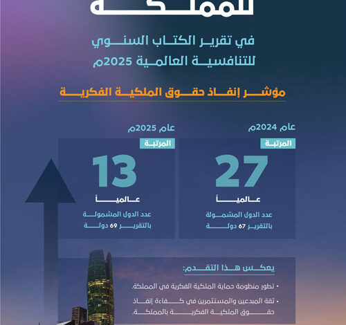 حققت المملكة إنجازًا نوعيًا جديدًا بتقدمها (14) مرتبة لتصل إلى المرتبة (13) عالميًا في مؤشر إنفاذ حقوق الملكية الفكرية، وذلك ضمن تقرير الكتاب السنوي للتنافسية العالمية لعام 2025، الصادر عن مركز التنافسية العالمي التابع للمعهد الدولي للتنمية الإدارية (IMD)، والذي يعد واحدًا