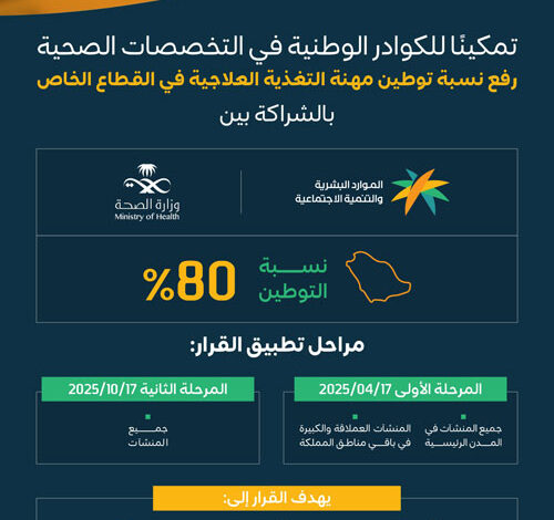 أعلنت وزارة الموارد البشرية والتنمية الاجتماعية وبالشراكة مع وزارة الصحة عن صدور قرارات رفع نسب التوطين لأربع مهن صحيّة في القطاع الخاص، التي تشمل مهنة الأشعة بنسبة 65 %، ومهنة المختبرات الطبية بنسبة 70 %، ومهنة التغذية العلاجية بنسبة 80 %، ومهنة العلاج الطبيعي