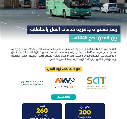 أعلنت الهيئة العامة للنقل عن رفع مستوى الجاهزية لخدمات نقل الحجاج بالحافلات بين المدن، تزامنًا مع قرب موسم حج هذا العام 1445هـ، حيث ستتوفر هذه الخدمات للحجاج الراغبين بالتنقل برًا عبر حافلات النقل بين المدن، ومن خلال 3 شركات رائدة ومتخصصة في نقل الركاب بالحافلات بين مدن ومناطق