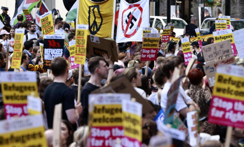 خرج آلاف البريطانيين السبت في مسيرات مناهضة للعنصرية ردا على أعمال عنف اليمين المتطرف التي هزت المملكة المتحدة على مدى أسبوع. وتم خلالها استهداف مساجد ومرافق إسكان المهاجرين في أعقاب مقتل ثلاث فتيات طعنا في حصة رقص في ساوثبورت في شمال غرب إنكلترا وأُصيب خمسة أطفال آخرين بجروح خطيرة. وتعيش الشرطة البريطانية حالة استنفار تأهبا لوقوع أعمال شغب.
