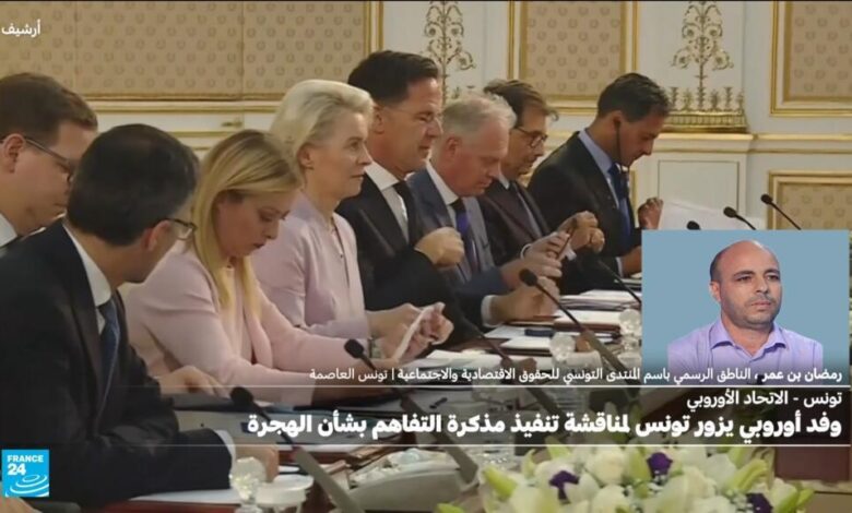 وصل وفد من المفوضية الأوروبية الى تونس في زيارة تتواصل إلى يوم غد الثلاثاء لمتابعة تنفيذ مذكرة التفاهم بين الاتحاد الأوروبي و تونس، وفق ما أكده مصدر من مكتب المفوضية في تونس لفرانس 24 ووقعت تونس و الاتحاد الأوروبي في 2023 مذكرة تفاهم تقوم على 5 عناصر أبرزها ملف الهجرة غير النظامية وكان المنتدى التونسي للحقوق الاقتصادية دعا في بيان إلى إيقاف العمل بمذكرة التفاهم وكل مسارات التعاون “غير العادلة” في مجال الهجرة بين تونس و الاتحاد الأوروبي ودوله.