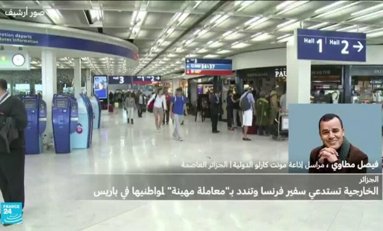 استدعت وزارة الخارجية الجزائرية الثلاثاء سفير فرنسا للتنديد بـ”المعاملة المهينة” التي تعرض لها مسافرون جزائريون لدى وصولهم إلى باريس، بحسب ما أفاد بيان رسمي.