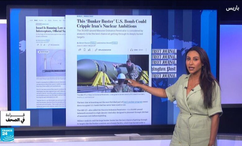 نتناول في هذه الفقرة من قراءة في الصحف أبرز المقالات حول الحرب بين إسرائيل وإيران. وول ستريت جورنال تكشف عن خبر حصري نقلا عن مسؤول أمريكي صرح بأن الجيش الإسرائيلي يكاد يستنفد مخزونه من صواريخ آرو التي تستخدم لاعتراض الصواريخ الباليستية الإيرانية طويلة المدى. كما تكشف أن القنبلة الأمريكية الخارقة للتحصينات GBU-57 التي تزن 30 ألف رطل والتي لم تُستخدم قط في أي حرب سابقا صُممت خصيصا لهدف تدمير برنامج إيران النووي. أما فيما يتعلق بمستقبل المرشد الأعلى آية الله علي خامنئي، فمقالات عديدة لا تعطي أهمية كبيرة لتداعيات التخلص منه. بينما تعتبر لوفيغارو أن اختفاءه لن يترك فراغا سياسيا بشكل نظري، تحذر الغارديان من تدمير النظام الإيراني على غرار ما حدث في العراق. كما تنقل صحف كثيرة ردود فعل الإيرانيين. لوبينيون ترصد شعورا متناميا بالوطنية بعد قصف إسرائيل لإيران حتى في صفوف الإيرانيين. والباحث الإيراني “أنوش غنجيبور” ينشر عريضة في لوموند يقول فيها إن لا شئ يبرر الاعتداء على وحدة أراضي بلده وإن الشعب فقط هو وحده المسؤول عن إسقاط النظام إن أراد.