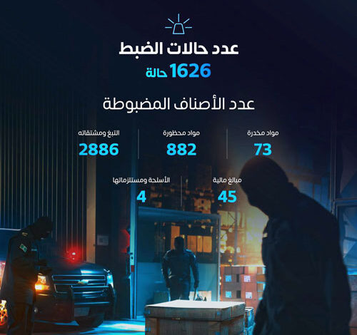 سجلت المنافذ الجمركية البرية والبحرية والجوية 1626 حالة ضبط للممنوعات، وذلك في إطار الجهود المستمرة التي تبذلها هيئة الزكاة والضريبة والجمارك «زاتكا» لتعزيز الجانب الأمني وحماية المجتمع من الممنوعات بمختلف أنواعها وأشكالها.