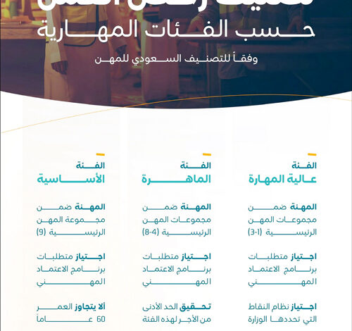 أصدر معالي وزير الموارد البشرية والتنمية الاجتماعية المهندس أحمد بن سليمان الراجحي، قرارًا وزاريًا بتصنيف رخص عمل العمالة الوافدة وفق ثلاث فئات مهارية رئيسية وهي: الفئة عالية المهارة، والفئة الماهرة، والفئة الأساسية، وذلك لتعزيز أداء العاملين ونقل الخبرة والتجارب إلى سوق