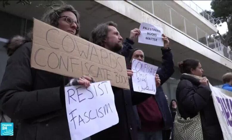 تجمع نحو ستين شخصا صباح الاثنين أمام محكمة إسرائيلية في القدس تضامنا مع فلسطينيين يملكان مكتبة اعتقلا الأحد في الشطر الشرقي المحتل من المدينة. وهتف المتظاهرون “إسرائيل دولة فاشية”، فيما رفع بعضهم لافتات تتهم الدولة العبرية بـ”الجبن”، بحسب مراسلي وكالة فرانس برس.