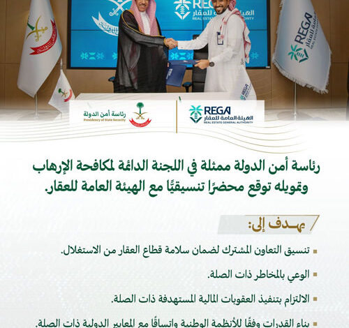 وقعت رئاسة أمن الدولة ممثلة في اللجنة الدائمة لمكافحة الإرهاب وتمويله محضراً تنسيقياً مع الهيئة العامة للعقار.