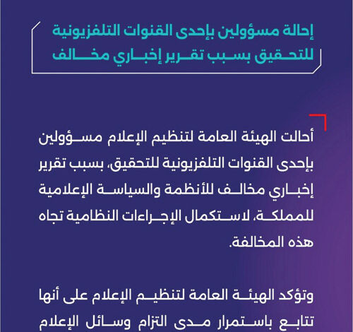 أحالت الهيئة العامة لتنظيم الإعلام مسؤولين بإحدى القنوات التلفزيونية للتحقيق، بسبب تقرير إخباري مخالف للأنظمة والسياسة الإعلامية للمملكة، لاستكمال الإجراءات النظامية تجاه هذه المخالفة.