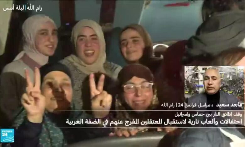 حيّت حشود متحمسة، بصيحات الفرح والغناء، معتقلين فلسطينيين أفرجت عنهم إسرائيل في إطار اتفاق وقف النار الذي بدأ سريانه الأحد، عند مرور حافلتين أقلتهما من سجن عوفر في الضفة الغربية المحتلة.