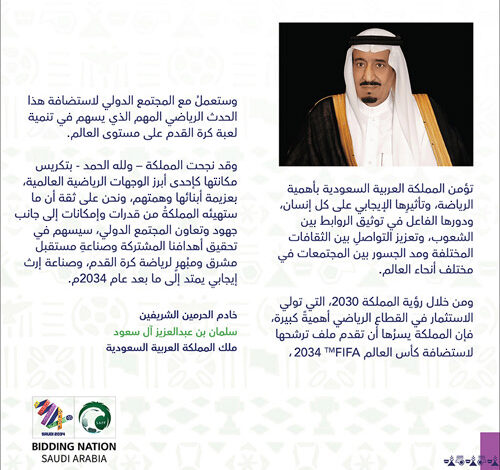 كشف الاتحاد الدولي لكرة القدم أمس عن تفاصيل ملف المملكة العربية السعودية الطموح لاستضافة أكبر نسخة على الإطلاق من تاريخ بطولة كأس العالم يتم تنظيمها في دولة واحدة، وذلك بعد تقديم المملكة لملف الترشح لاستضافة كأس العالم FIFA™ 2034 بشكل رسمي في العاصمة الفرنسية باريس.