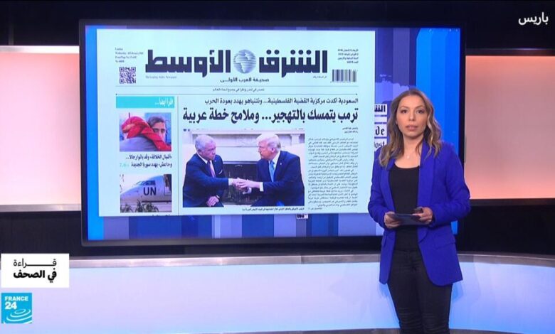 في الصحف اليوم: ترامب يجدد تمسكه بتهجير الغزيين رغم “حرارة” لقائه بملك الأردن، وتصريح لنائب الرئيس الأمريكي ستيفن ميلر في مقابلة على قناة فوكس نيوز يعتبر أن نهج ترامب يتلخص في منح الحكومة الإسرائيلية الحرية الكاملة لاستئناف العملية العسكرية إذا لزم الأمر. صحف فرنسية تتحدث عن مشروع ممر جديد يربط أوروبا بالهند ويمر عبر الشرق الأوسط ويعتبر منافسا لطريق الحرير الصيني. وصحيفة لوفيغارو تنشر تحقيقا أجرته بعد شهرين من سقوط الأسد لفك لغز “الجهادي السابق” أحمد الشرع.
