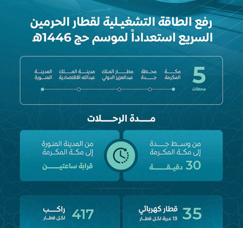 أعلنت الخطوط الحديدية السعودية «سار»، عن خطتها التشغيلية لموسم حج عام 1446هـ، التي تتضمن توفير نحو مليوني مقعد لنقل ضيوف الرحمن عبر قطار الحرمين السريع، مسجلة بذلك زيادة تُقدّر بـ (400) ألف مقعد عن موسم حج 1445هـ لتحقق زيادة تبلغ (25 %).