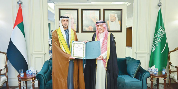 سفير المملكة لدى الإمارات يُقلّد نهيان بن سيف وشاح الملك عبدالعزيز