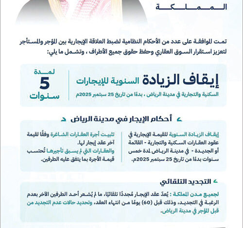 إنفاذًا لما سبق أن وجَّه به صاحب السمو الملكي الأمير محمد بن سلمان بن عبدالعزيز آل سعود ولي العهد رئيس مجلس الوزراء -حفظه الله-، بالبدء في تنفيذ حزمةٍ من الإجراءات النظامية الجديدة لسوق الإيجار في مدينة الرياض؛ استجابةً للتحدَّيات التي شهدتها العاصمة خلال السنوات الماضية