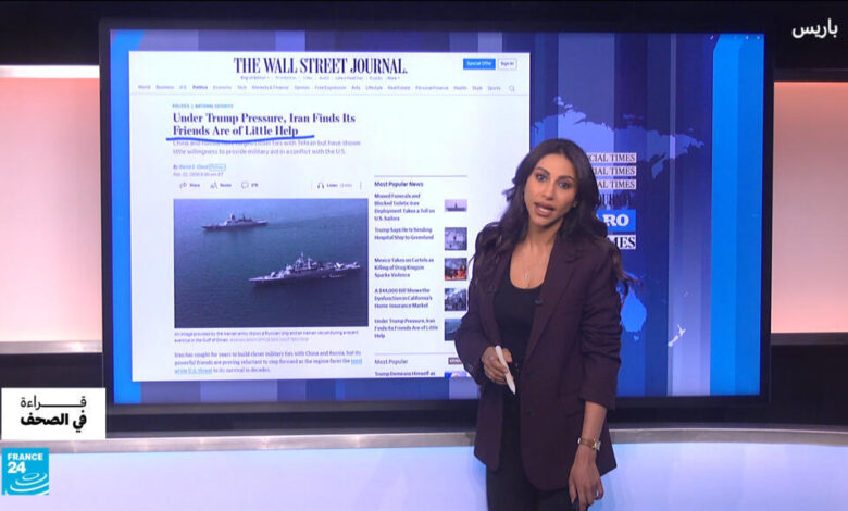 في عناوين الصحف اليوم : تقرير حصري لفاينانشيال تايمز حول صفقة عسكرية سرية بين إيران وروسيا يُعتقد بأن يكون جزءا من الصواريخ سُلم بالفعل إلى طهران بحسب بيانات الرحلات الجوية في الأيام الأخيرة – مقال تحليلي في وول ستريت جورنال حول حجم الدعم الذي يقدمه حلفاء إيران لها؟ – تخوف من استراتيجية الغموض الاستراتيجي حول أهداف ترامب من حرب محتملة على نظام المُلالى – قراءة في التايمز البريطانية حول صاحب قرار المواجهة. نتابع أيضا تعليقات الصحف حول ذكرى مرور أربع سنوات على الحرب الروسية الأوكرانية، ما مستقبل محادثات السلام؟ لماذا لا تنتصر موسكو؟ وتقرير حول متوسط ​​عمر الجنود الروس الذي يبلغ 12 دقيقة فقط في قرية قرب زابوريجيا وفقًا لضابط أوكراني.