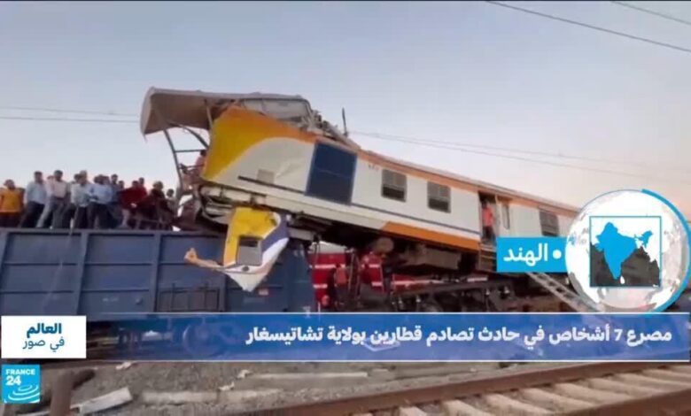 أسفر حادث اصطدام قطارين، واحد ينقل ركابا بآخر للبضائع في مدينة بيلاسبور بولاية تشاتيسغار فى الهند ، عن مقتل 7 أشخاص على الأقل.