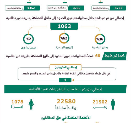 أسفرت الحملات الميدانية المشتركة لمتابعة وضبط مخالفي أنظمة الإقامة والعمل وأمن الحدود، التي تمت في مناطق المملكة كافة، وذلك للفترة من 14-12-1445هـ الموافق 20-06-2024م إلى 20-12-1445هـ الموافق 26-06-2024م، عن النتائج التالية: