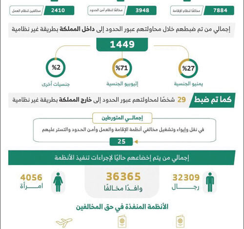 أسفرت الحملات الميدانية المشتركة لمتابعة وضبط مخالفي أنظمة الإقامة والعمل وأمن الحدود، التي تمت في مناطق المملكة كافة، وذلك للفترة من 07/ 10/ 1447هـ الموافق 26/ 03/ 2026م إلى 13/ 10/ 1447هـ الموافق 01/ 04/ 2026م، عن النتائج التالية: