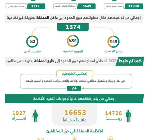 أسفرت الحملات الميدانية المشتركة لمتابعة وضبط مخالفي أنظمة الإقامة والعمل وأمن الحدود، التي تمت في مناطق المملكة كافة، وذلك للفترة من 14/ 04/ 1446 هـ الموافق 17/ 10/ 2024 م إلى 20/ 04/ 1446هـ الموافق 23/ 10/ 2024م، عن النتائج التالية: